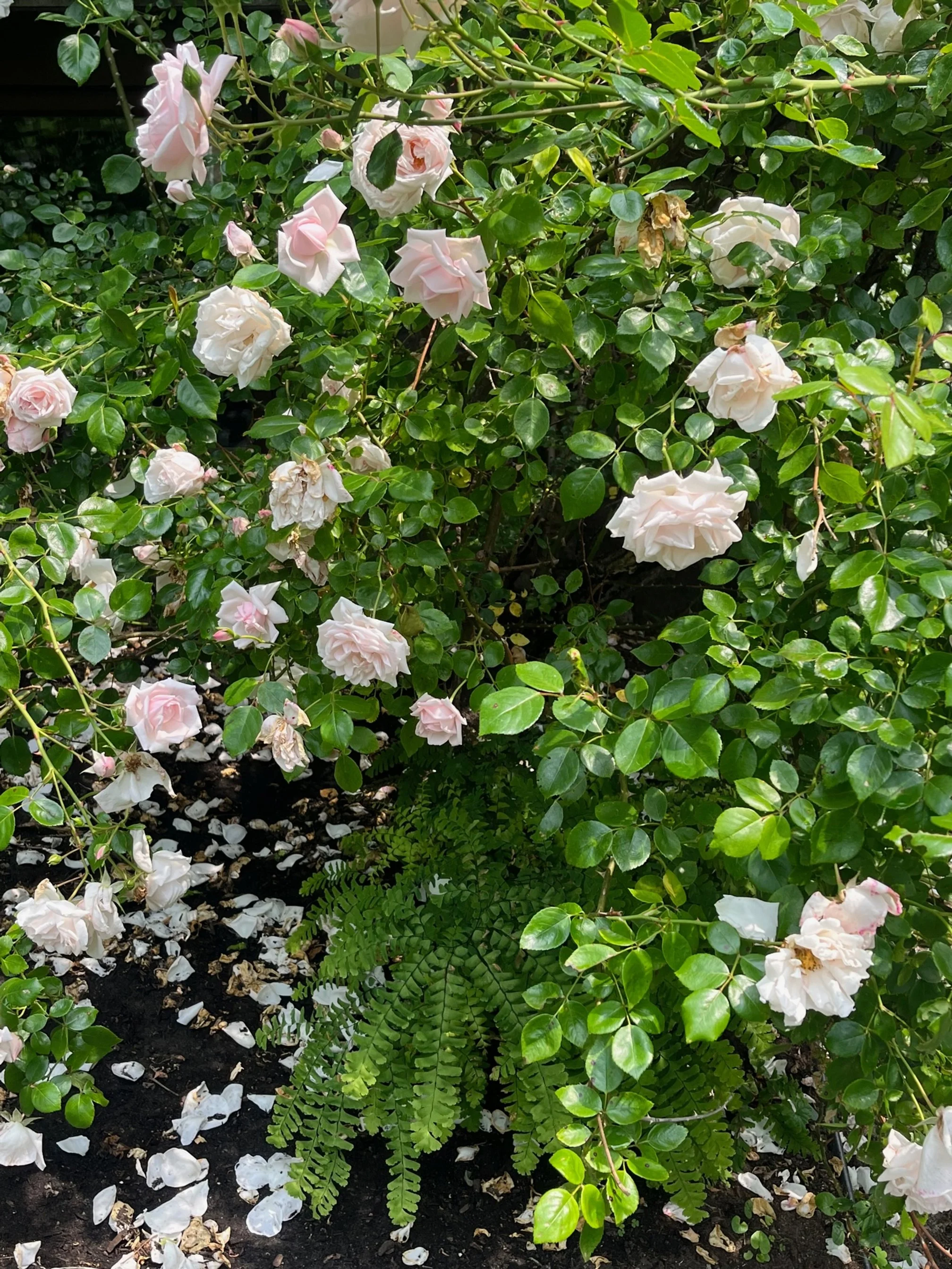I like the serendipity of this combination of maidenhair fern, which is frilly, with thorny pink roses.